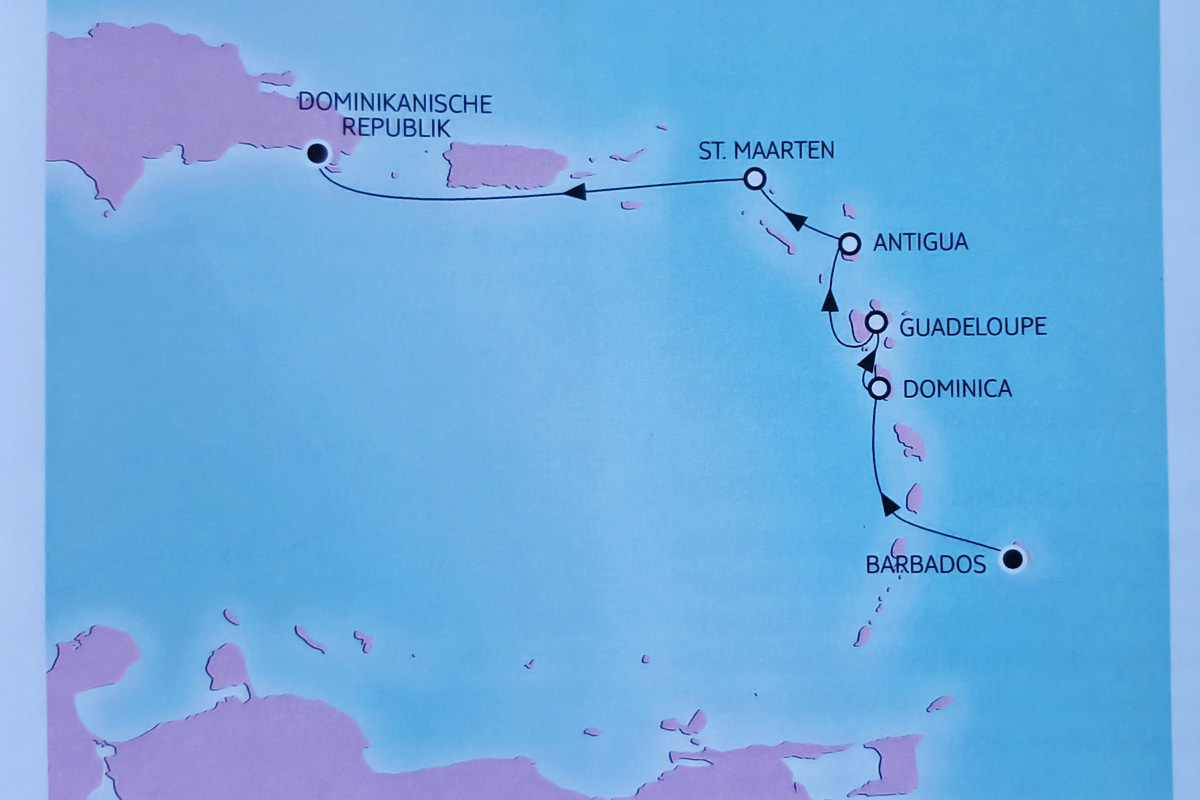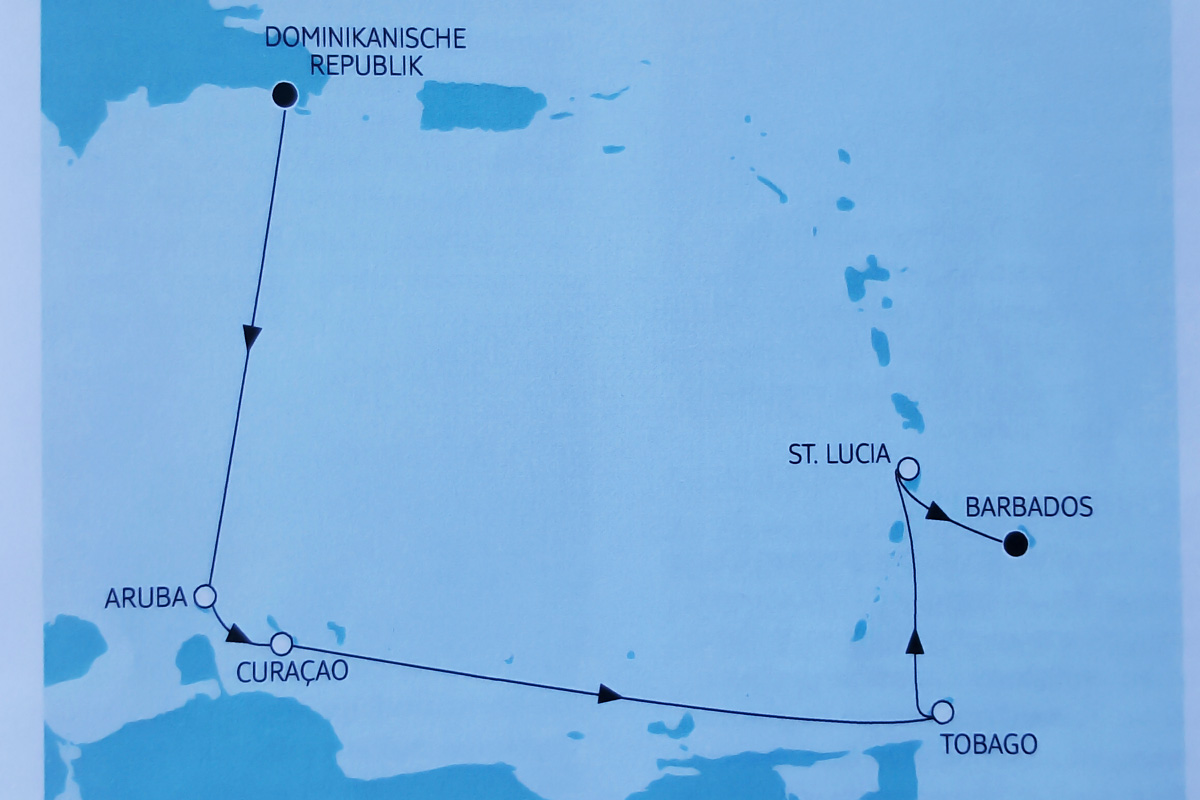 Ein Blick auf die geplante Route. Es gab eine kleine Programmänderung. Anstelle von Grenada wurde St. Lucia in der ersten Woche angelaufen, Tobago dafür einen Tag früher als ursprünglich vorgesehen.