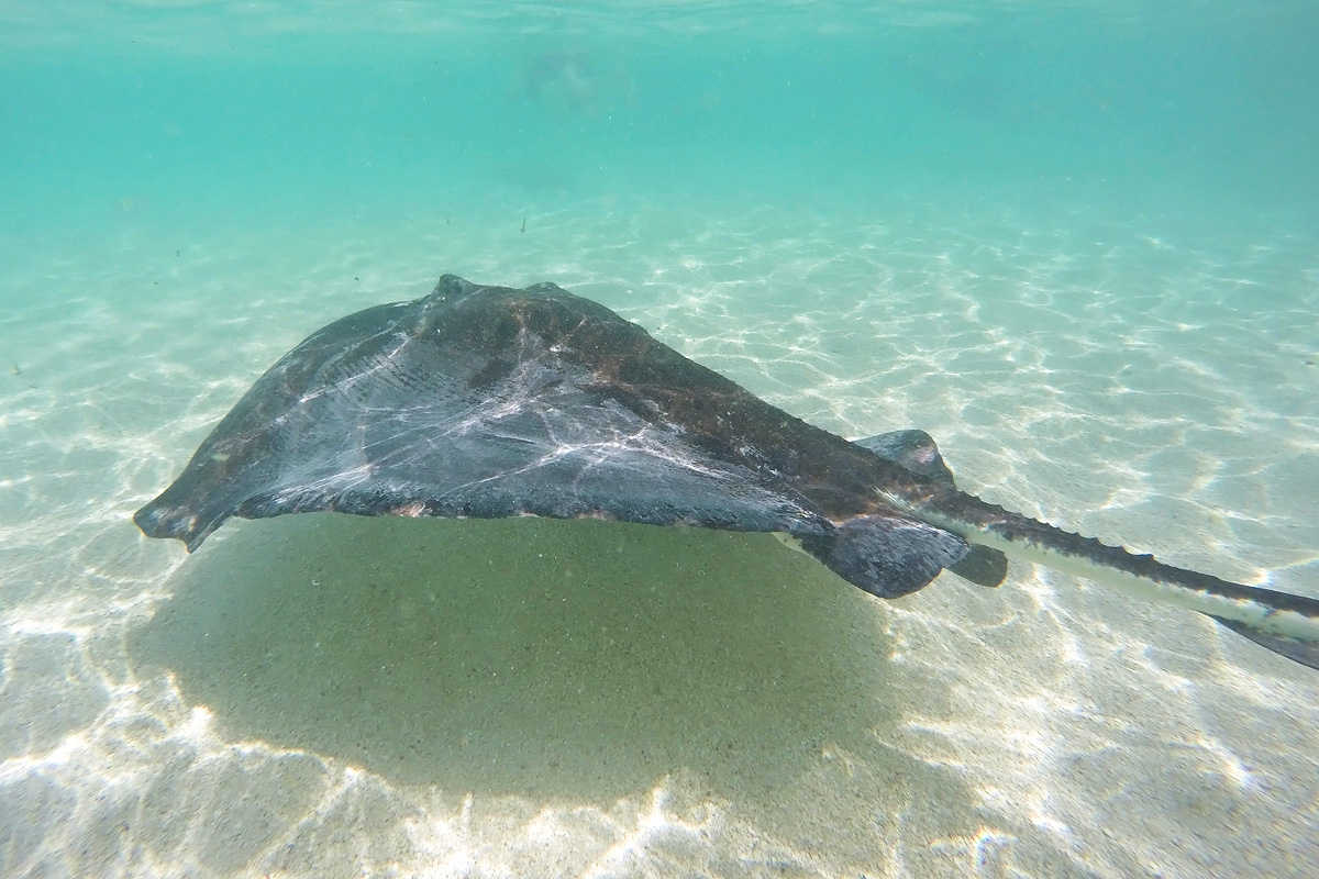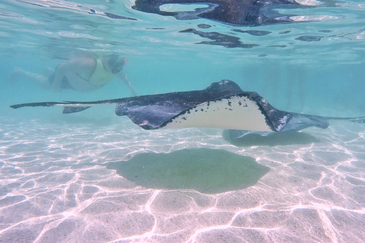Für Mittag hatten wir einen Ausflug gebucht. Es ging mit dem Kleinbus auf die andere Seite der Insel zu einem Gebiet in dem viele Rochen leben. Mit dem Boot wurden wir zu einer Sandbank rausgefahren, wo wir mit den majestätischen Fischen schnorcheln konnten:
